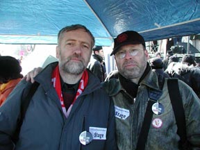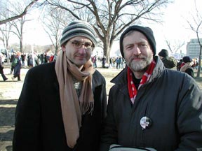 On January 18, Mr. Corbyn spoke at the mass demonstation on the Mall in Washington, DC. His speech was very well received by over 200,000 people who came out in sub-freezing tempatures. (Pictured above: Left - Jeremy Corbyn with Michael Letwin, Co-Convener, New York City Labor Against the War and Pres., Ass'n. of Legal Aid Attorneys/UAW L.2325; right - Sam Husseini, Communications Director of Institute for Public Accuracy with Mr. Corbyn, who was waiting to be interviewed by Pacific Radio. See PhotoAlbum of January 18 and 19 rallies and action.