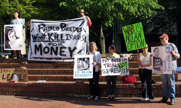 Kevin Benderman - Pablo ParedesOn May 10, 2005 a national day of action took take place in support of Navy Petty Officer Pablo Paredes and US Army Sergeant Kevin Benderman and other military personnel who have refused to fight in the current war and occupation of Iraq. Kevin Benderman in Fort Stewart, Georgia and Pablo Paredes in San Diego face courts-martial on Wednesday, May 11. More funds are needed for Kevin Benderman's defense.