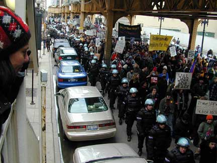 Braving temperatures in the low 30s, the crowd stomped through tunes by the Beastie Boys and hip-hop artist Common that played through the public-address system and gave speeches before marching through downtown Chicago. They were escorted by an almost equal number of Chicago police officers with riot gear.