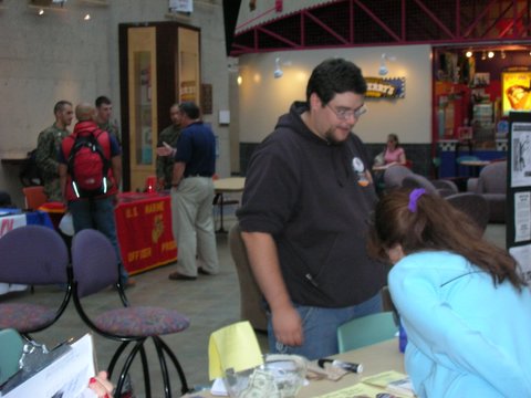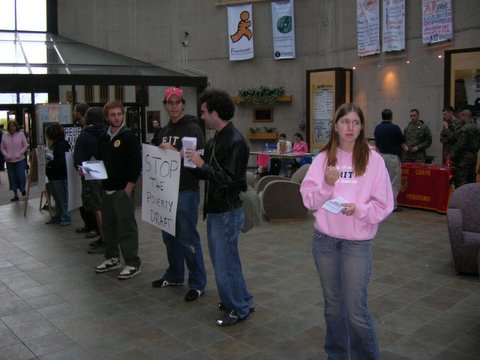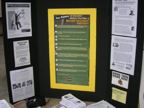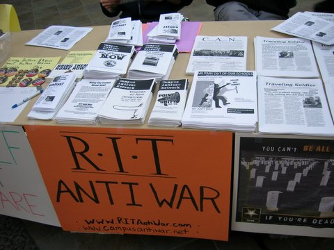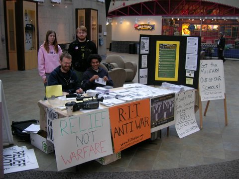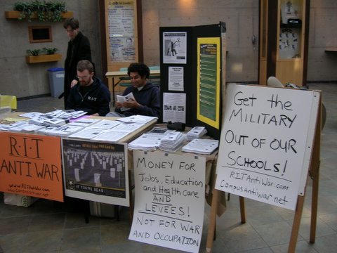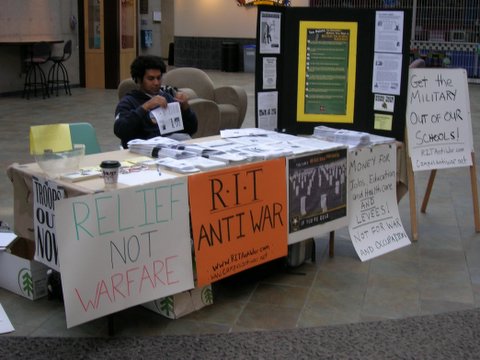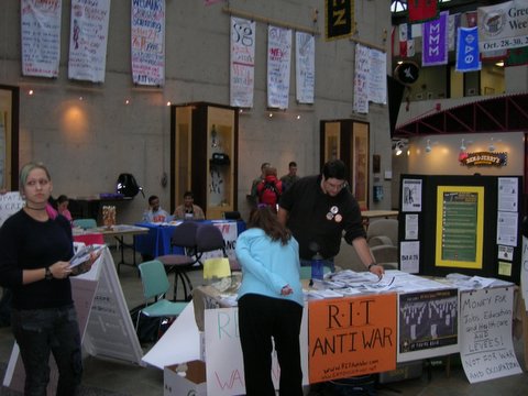 October 19, 2005ROCHESTER, NY- Members of RIT Anti War, the student antiwar group and Campus Antiwar Network chapter at the Rochester Institute of Technology found out that Marine Corps recruiters would be in the Student Alumni Union and once again could not let them be left unchallenged. RIT Anti War reserved space likewise and that morning set up our enormous table full of counter-recruitment, CAN and Anti War literature. We also used this as an opportunity to build our "Military Out of Our Schools" meeting the next day.