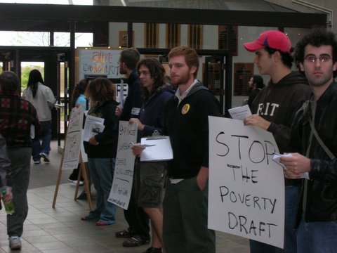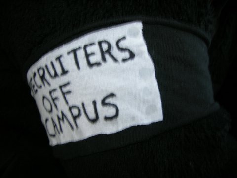 Only 3-4 students made it to the Marines table and we're immediately engaged by Anti War activists after leaving. All of which said they "had no plans on joining." During the afternoon rush our strength grew to 23 activists. We formed a huge line, holding "College Not Combat" and "Troops out Now" banners and signs. The line stretched from our table to the other side of the Union hall. We handed out over 400 pamphlets and signed up around 50 people to join RIT Anti War. Ironically, a fire alarm went off after frustrated campus administrators left the table, so we quickly moved outside to catch everyone walking out of the building, activists held signs high and one even stood next to the group of recruiters holding a sign in the air that read "College Not Combat." After being effectively blocked from the majority of traffic through the Union the recruiters packed up and left 3 hours early. This was the second successful counter-recruitment effort at RIT and represents how organizing counter-recruitment actions can effectively challenge any military presence on campuses. Many people joined in on the action as well, once again concretely showing the opportunities of the antiwar movement. Full steam ahead for the CAN counter-recruitment conference in Berkley, eight members will be going.