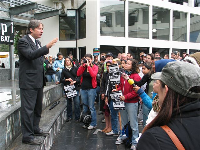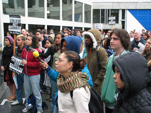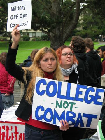 About 200 students at San Francisco State University rallied yesterday to protest military recruitment on our campus. The protest was organized by a coalition of student organizations including Students Against War, MechA, the General Union of Palestinian Students, the College Democrats, VOX (Voices for Sexual Freedom), The International Socialist Organization, and Speak Out.