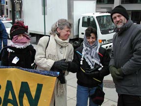 Mike Zmolek, Outreach Coordinator for the National Network to End the War Against Iraq, organized a reception for Jeremy Corbyn after the rally on January 18. The next day, on the way to march to LaFayette Park, Mr. Corbyn poses with Sunny Miller, Executive Director of Traprock Peace Center, who is flanked by two frozen Floridians.