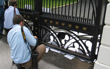 People held up the petition pages when they learned that the White House would not accept hand delivery of the petition. The delegation delivered the petition through the gate (reportedly, a guard said that they could leave the petition).